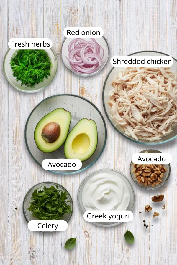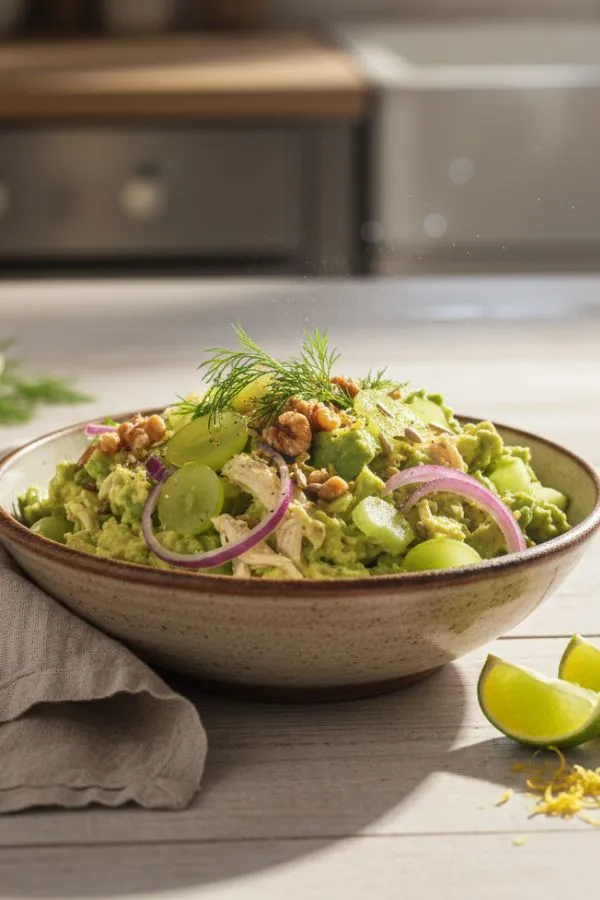 - 1–2 avocados, ½–¾ cup Greek yogurt, 2–3 Tbsp lemon juice, celery, red onion, herbs, optional grapes or nuts.