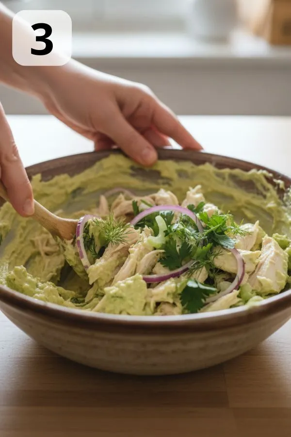 - Step 3: Fold Everything In (2–3 minutes): Add your chicken, celery, onion, herbs, and any extras like nuts or grapes. Stir gently—don’t overmix or you’ll lose that nice chunky texture.