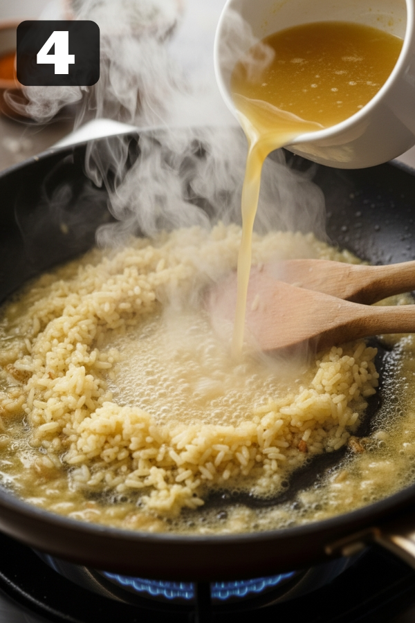 - Step 4: Add Liquid & Simmer: Pour in the chicken broth slowly; let it loosen the browned bits on the bottom. Scrape gently so the flavor melts into the liquid. Bring to a gentle simmer. Lower heat, cover with a tight lid, and let the rice cook quietly.