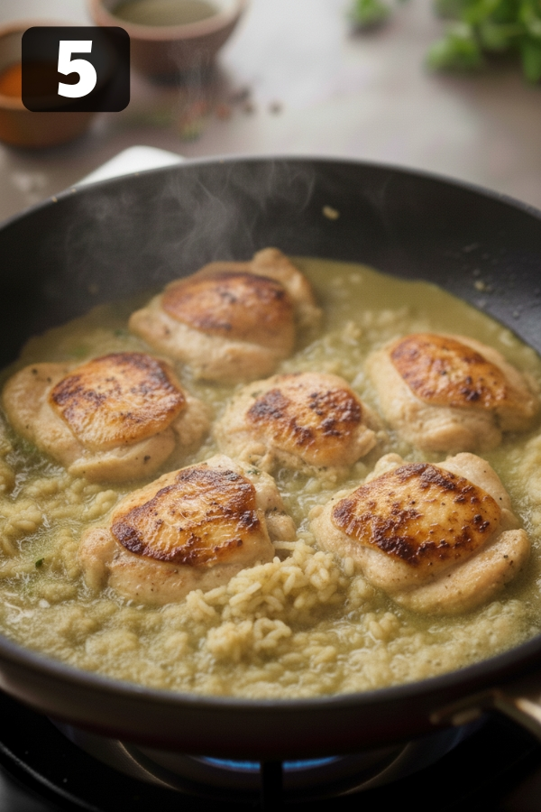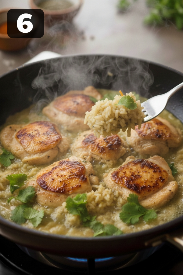 - Step 5: Add the Chicken Back: Nestle the seared chicken pieces on top of the rice. Pour in any juices from the resting plate—they’re pure flavor. Cover the pan again. Cook until the rice is tender and the chicken is fully done (usually 12–15 minutes).