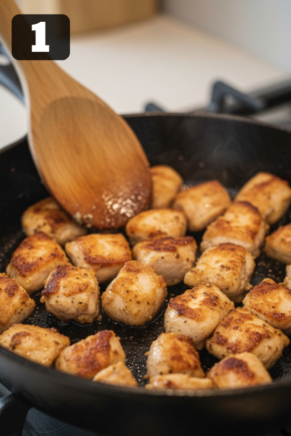 - Step 1: Sear the Chicken: Heat olive oil in a large skillet over medium-high. Add seasoned chicken (salt, pepper, garlic powder) and cook until golden brown, about 5–6 minutes. Remove and set aside.