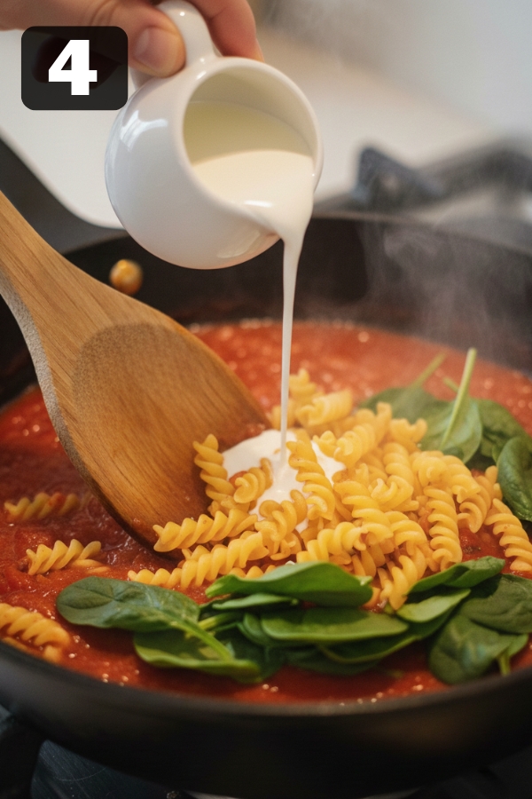 Add uncooked pasta. Cover and simmer 10–12 minutes, stirring occasionally. Add a splash of broth or water if it thickens too fast. - Add Spinach & Cream